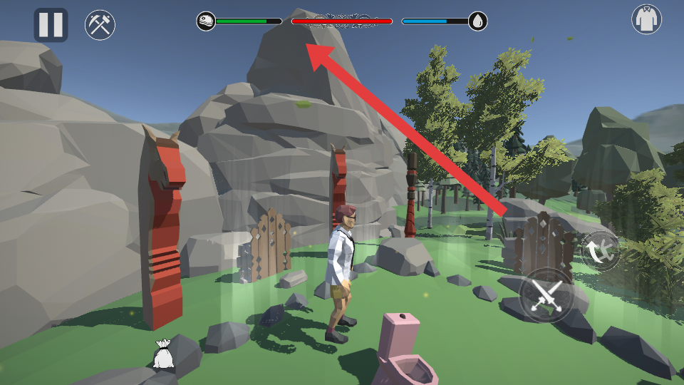 1、进入场景后,需要朝着山体的区域进行探索,注意角色头顶的三个数值,分别为饥饿值、生命值、饥渴值。