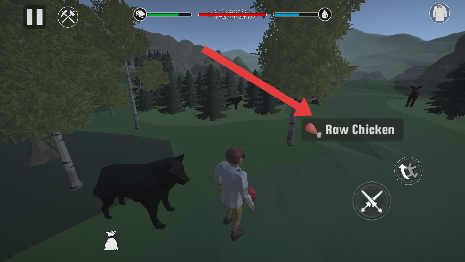 3、当发现Raw Chicken生鸡肉时,需要谨慎的拾取,时刻注意周边野兽如狼,避免遭遇它们的攻击。