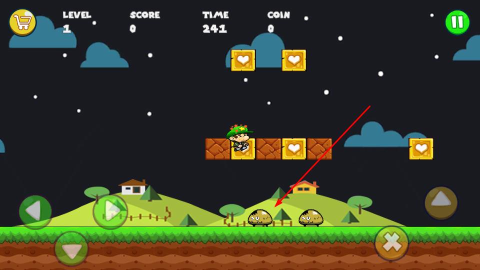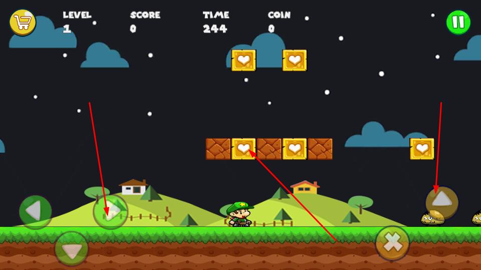 2、操作移动左侧按钮控制角色左右行进,右侧三角键触发跳跃动作,需精准操作让角色收集空中及平台上的爱心方块,同时警惕地面爬行怪物。