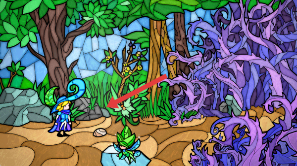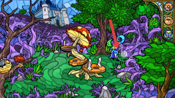 2、遇到紫色荆棘,寻找场景中特殊的物品比如蘑菇的平台、蝴蝶的标志,点击使用魔法角色蓝袍。