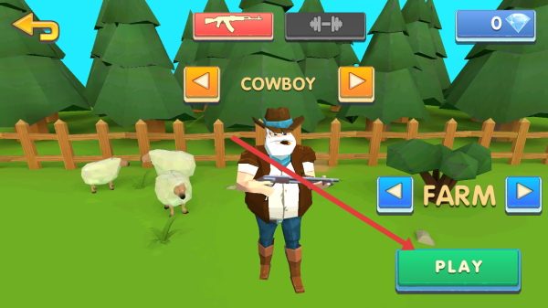 2、选定COWBOY角色后,通过点击绿色PLAY按钮,进入游戏场景,开启僵尸对抗之旅。
