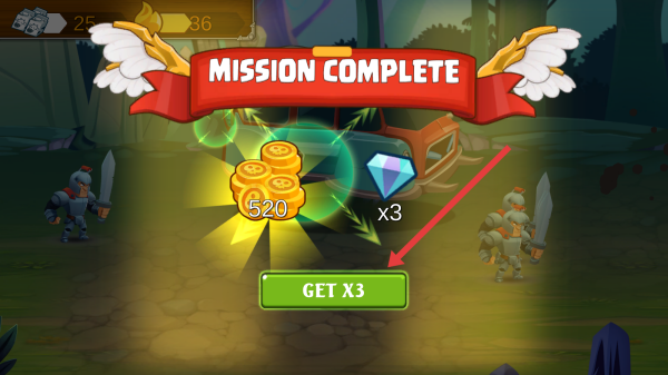 3、任务完成后,按照箭头指示,点击绿色GET-X3按钮,获取520金币与3颗钻石的三倍奖励。