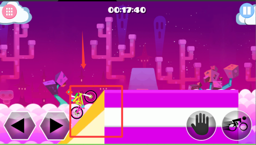 1、进入游戏后先选择一个关卡开始挑战,用左右按钮控制单车平衡,保持平稳前进避免翻车摔倒。