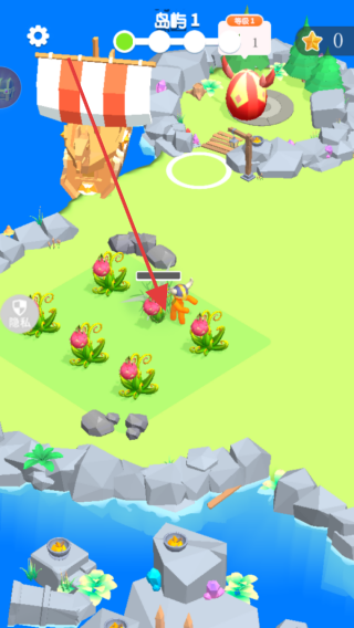 2、在岛屿1,角色遇粉色花朵植物,靠近后进行攻击,清除障碍,同时可收集场景资源,推进岛屿探索进度。
