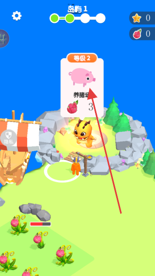 3、解锁新区域后,遇到养猪场 等级2建筑,按提示投入3个果实,升级养猪场,解锁新功能,助力岛屿发展。