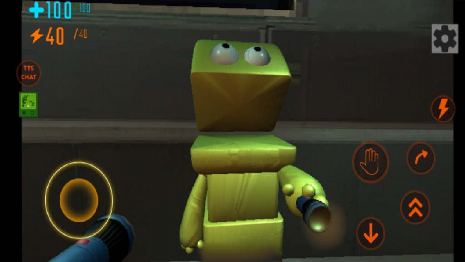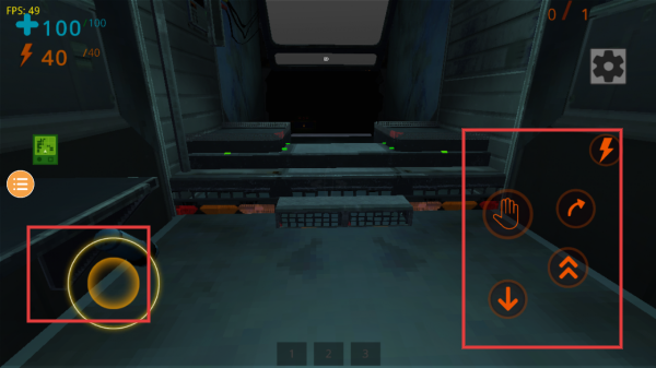 2、在游戏场景,左侧摇杆控制移动,右侧按键手掌、扳手等对应交互、操作功能,利用这些操控角色在空间行动。
