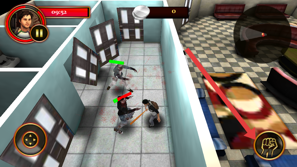 2、战斗中利用沙发、乒乓桌等房间掩体,绕后攻击丧尸背部,减少自身受击,关注丧尸红、绿色血量条。