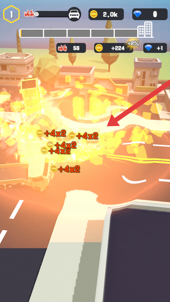 2、通过撞击等操作触发爆炸的特效,画面中大量+4x2金币标识显示,爆炸可以获取多倍金币奖励,提升收益效率。