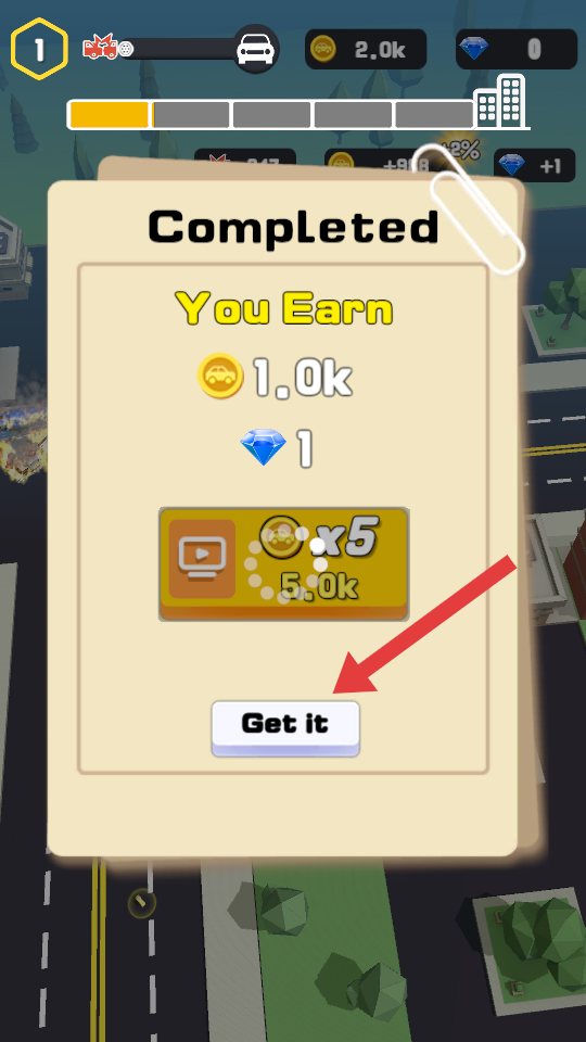 3、关卡完成后,点击界面中的Get it按钮,领取1.0k金币与1颗钻石的奖励,退出结算界面继续游戏。
