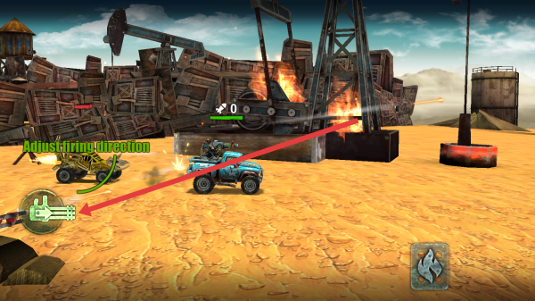 3、战斗过程中,点击左侧武器方向调整按钮,旋转武器攻击角度,精准打击敌方载具,推进战斗进程。