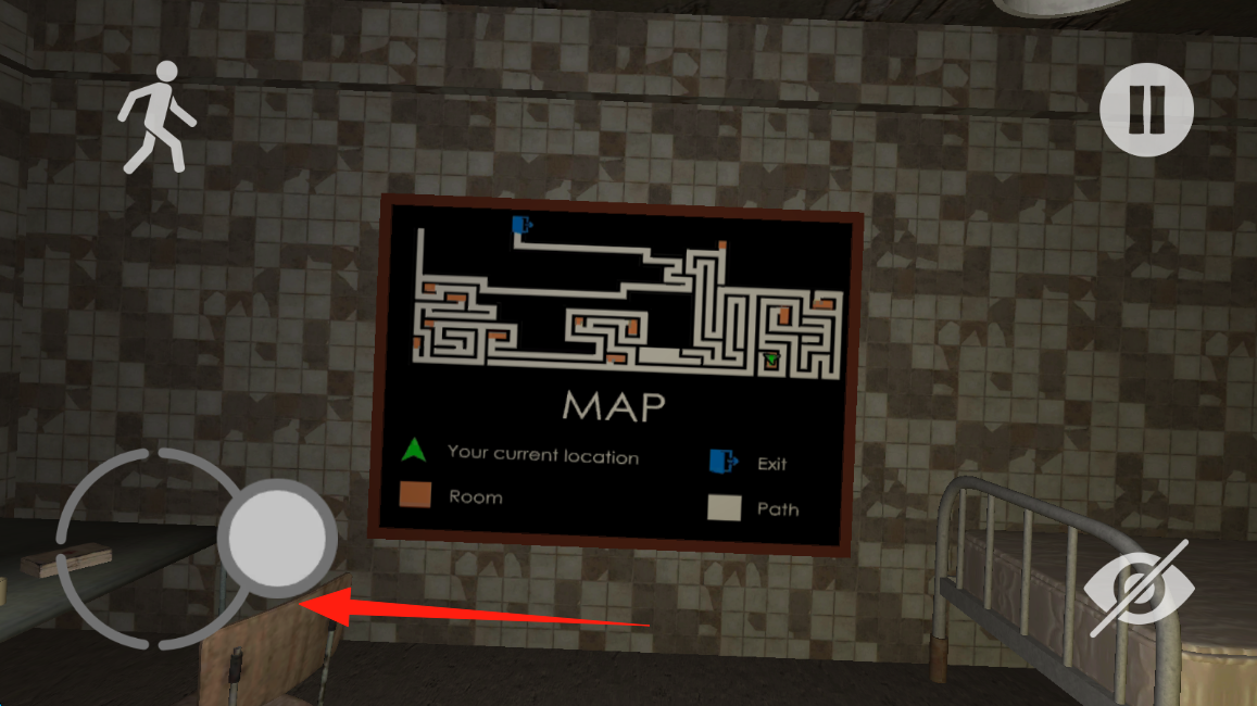 2、通过左侧摇杆控制角色移动,查看墙上地图,识别出口Exit、房间Room等标识,规划逃生路径。