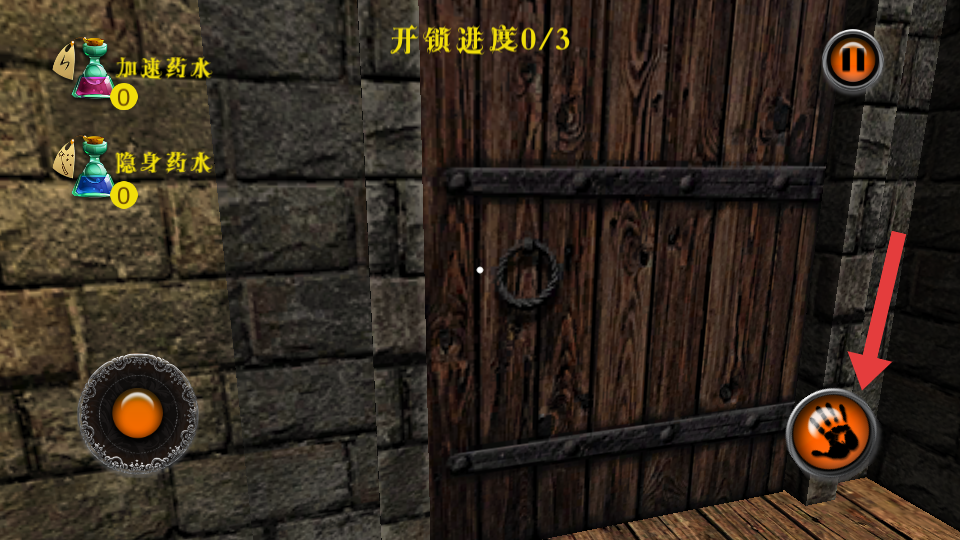 3、面对木门点击手掌按钮打开,需要收集3个开锁道具,左侧加速药水、隐身药水可以辅助行动,解锁最终的大门。