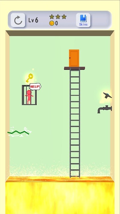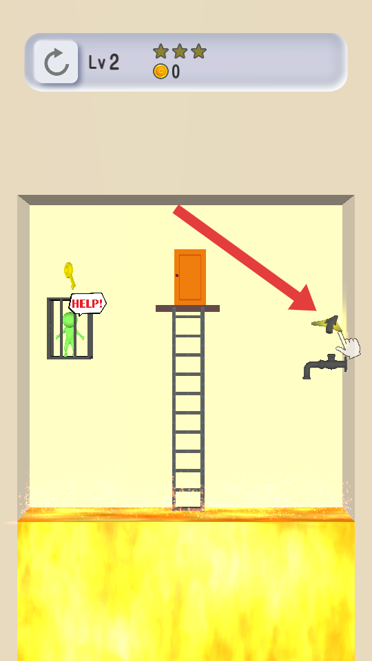 3、进入Lv2先拾取右侧扳手,打开水龙头熄灭地面的火焰,再获取笼子上方钥匙救出小人,最终通过梯子前往橙色门。
