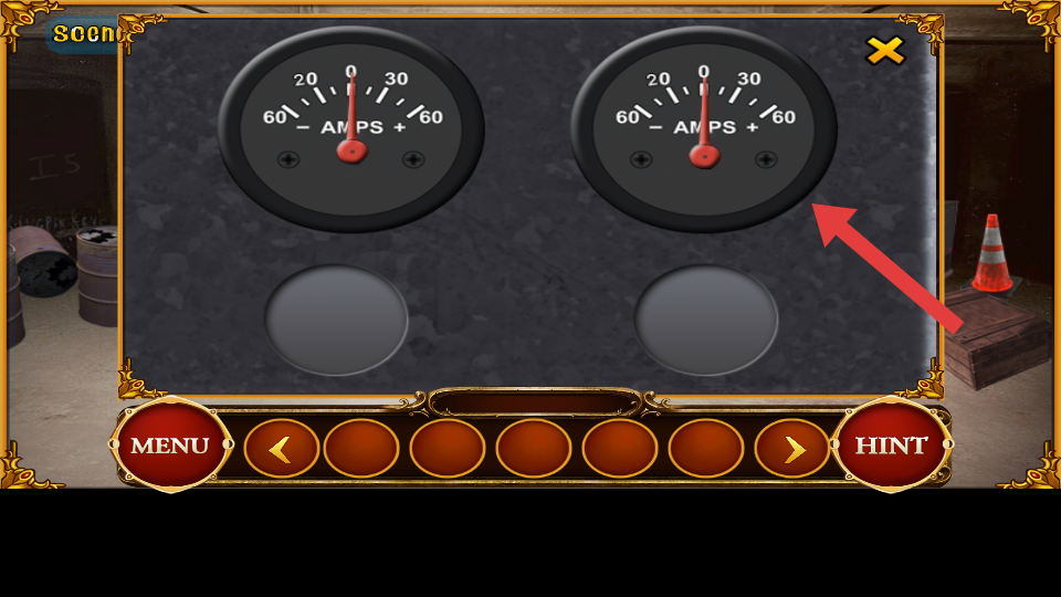 1、观察两个标有AMPS的仪表,其指针均指向0,这是电力谜题的初始状态,需要后续调节数值以推动机关解锁。