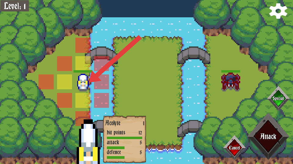 1、操控角色Acolyte12点血量、5攻5防,点击Attack的按钮,准备攻击敌方蜘蛛,开启战斗交互。