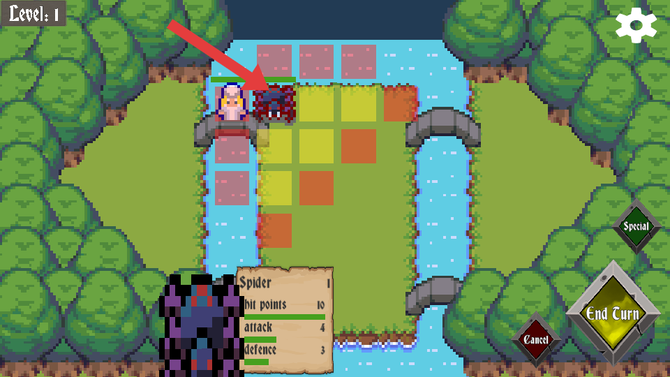 2、观察蜘蛛属性10点血量、4攻3防,完成攻击操作后,点击End Turn结束当前的回合,进入下一步骤。