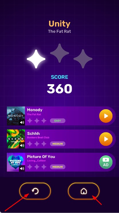 3、歌曲结束看评分,重玩点击左下角按钮或返回主页点击右下角按钮。