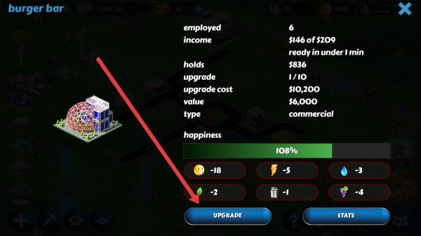 3、进入Burger-bar详情页,点击蓝色UPGRADE按钮,消耗10200金币升级该商业建筑,提升收益。