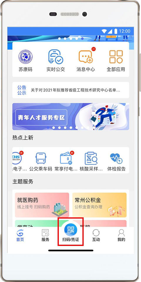1、从本站下载我的常州app官方版,安装后进入,选择“扫码/亮证”。