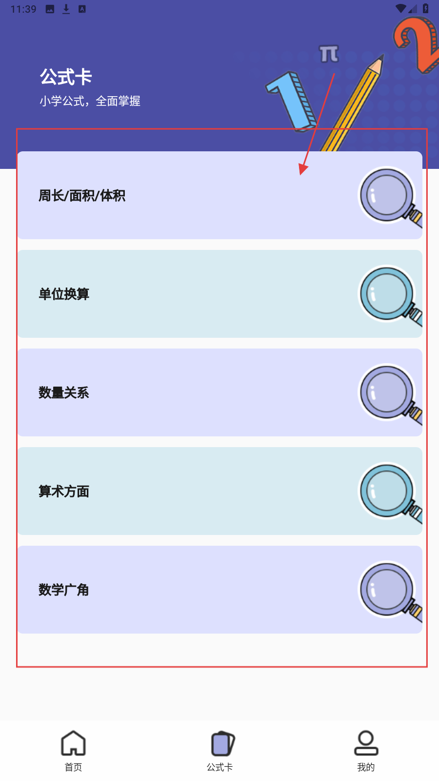 2、进入【公式卡】页,选【周长/面积/体积】等分类,查看对应公式。