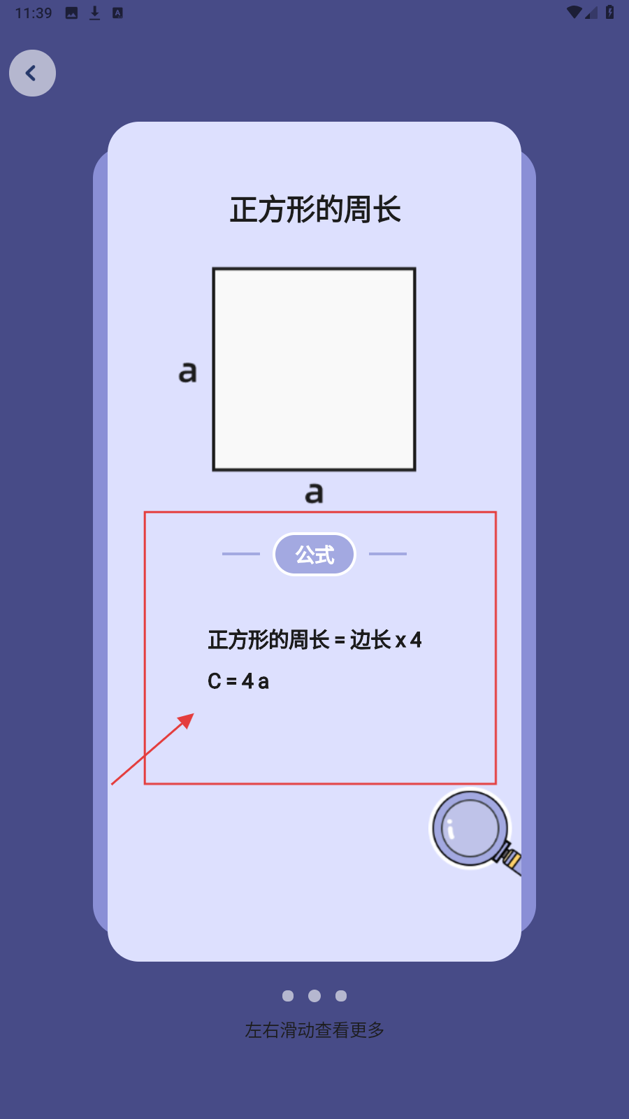 3、进入公式详情,如正方形周长,记“C=4a”公式,理解含义。