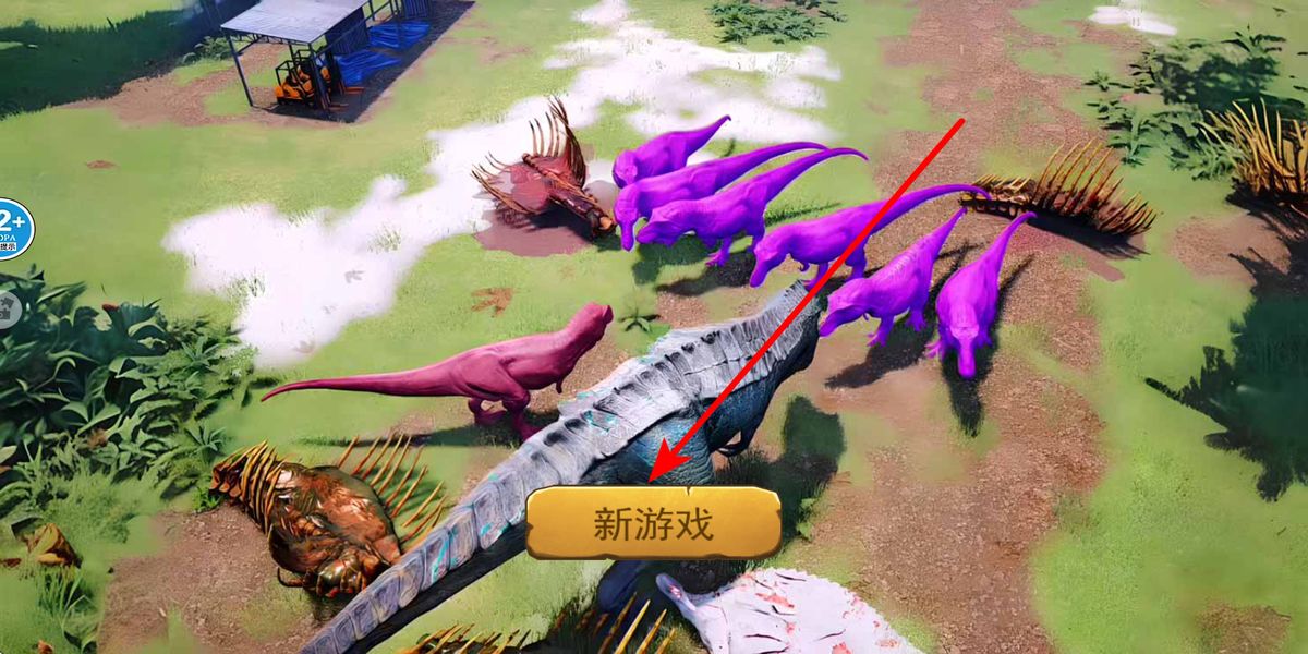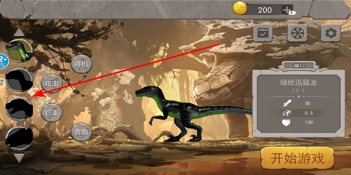 1、点击新游戏进入,在角色的选择界面,依据恐龙的属性与自身喜好选初始恐龙,确认后点开始游戏后,开启原始森林冒险。