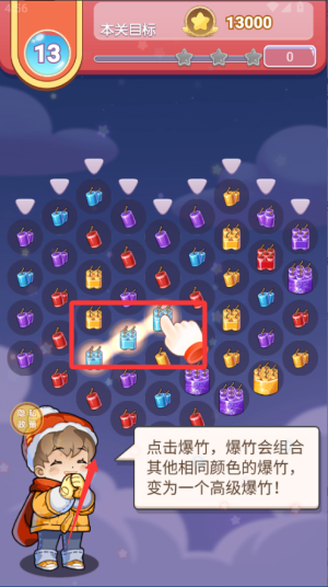 1、基础操作简单直观,手指滑动连接相邻的同色爆竹,形成3个以上连线即可消除,连击数量越多奖励分数加成越高。