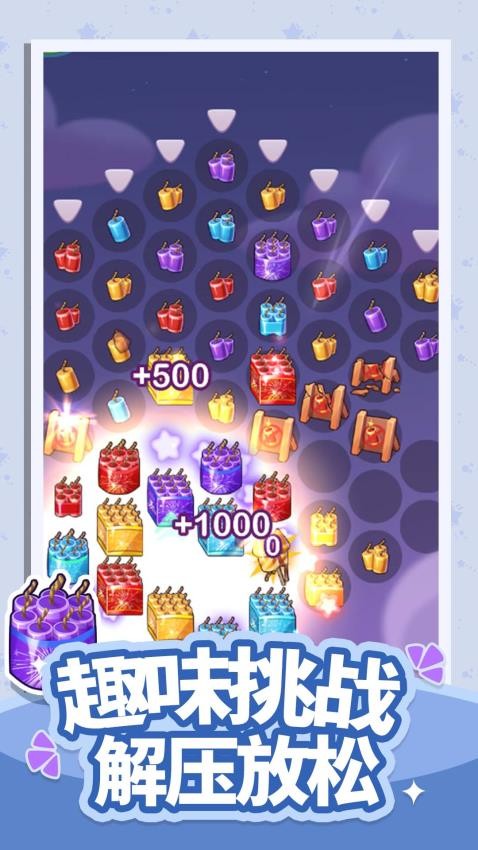 3、特效反馈即时,操作反馈感强。每次成功消除都会伴随烟花绽放动画与震动提示,增强游戏过程的沉浸体验。