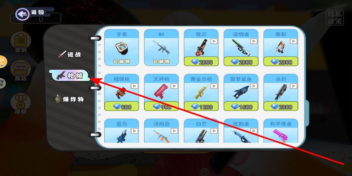 2、在武器界面选枪械等分类,依据喜好与破坏需求挑合适武器,如想大范围破坏可选榴弹枪,按需解锁购买,为搞怪战斗备足工具。