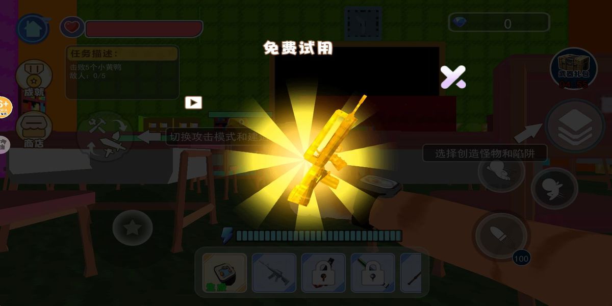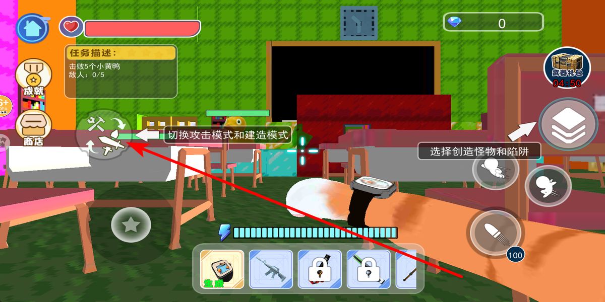 3、战斗时留意切换攻击模式和建造模式按钮,遇任务需求或想改变玩法,点击切换,攻击模式专注破坏,建造模式可创造陷阱,灵活运用提升体验。