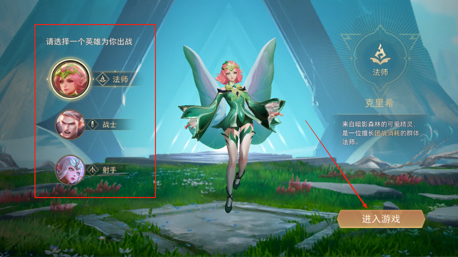 1、进入游戏,在英雄选择界面,可看到法师、战士、射手等不同定位的英雄,根据喜好和对战需求,选择一个英雄,然后点击进入游戏,开启对战。