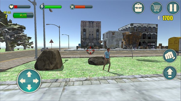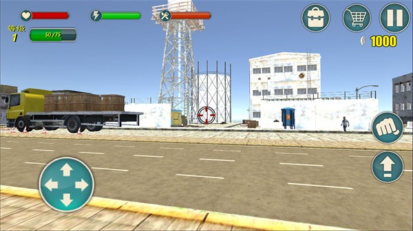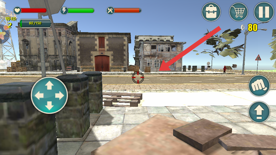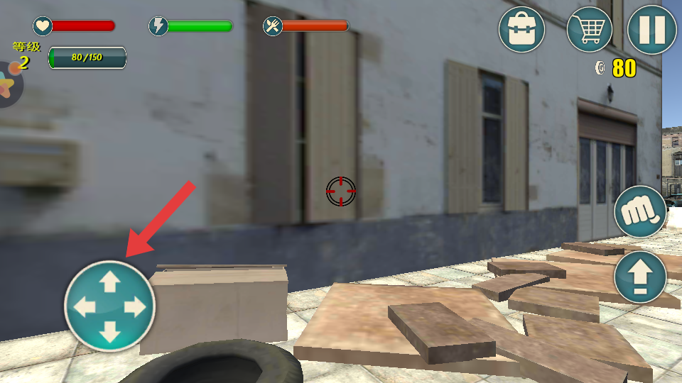 1、用虚拟摇杆移动,沿街道探索建筑,留意金币80,靠近可拾取;遇敌人,需要拳头图标攻击。