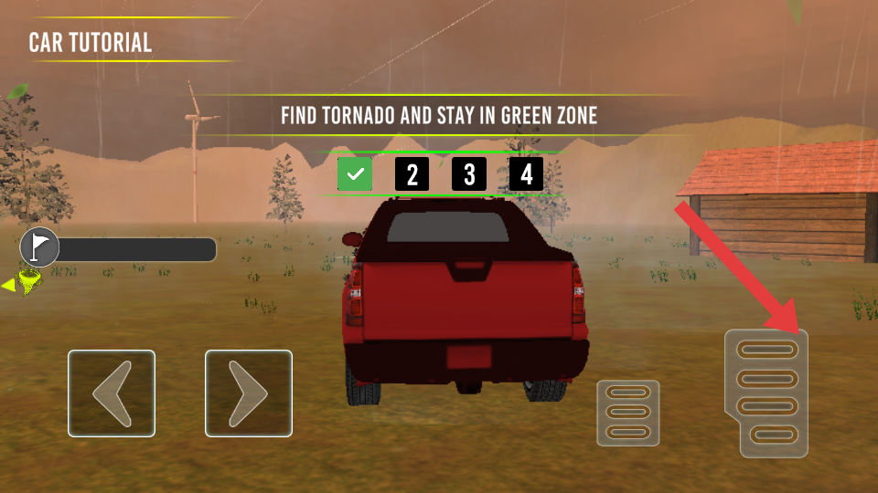 1、用左右箭头控制方向,踏板控制车速,沿黄色指引找龙卷风,靠近时留意绿色区域提示。