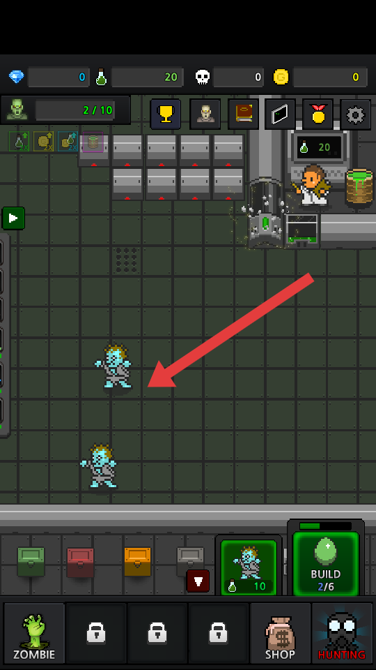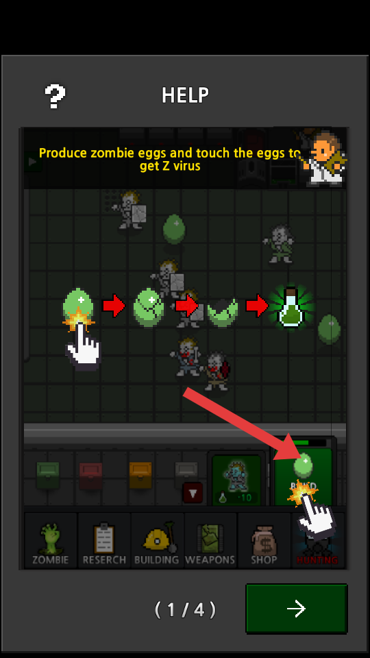 1、进入游戏,点击下方HUNTING栏绿色蛋图标,生产了僵尸的蛋,按照提示触碰蛋,获取Z的病毒。