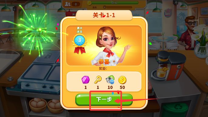 4、通关后点击"继续"按钮,即可自动跳转至全新美食挑战关卡。