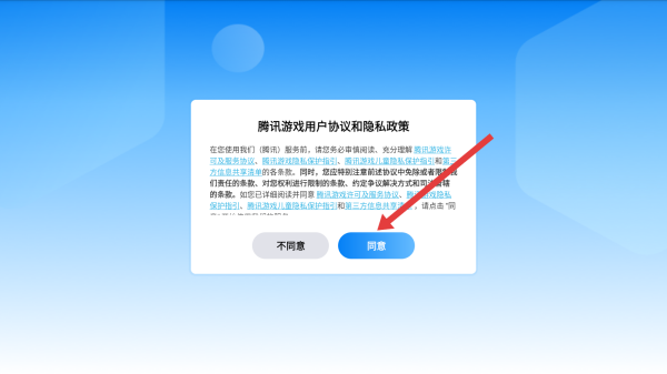 1、启动游戏时,弹出腾讯游戏用户协议和隐私政策弹窗,点击同意按钮,进入节奏大师登录界面。