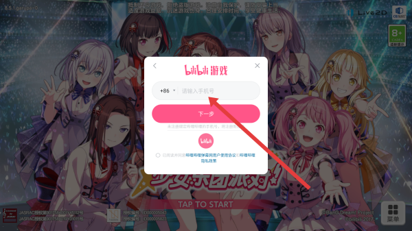 1、点击BanG-Dream!少女乐团派对启动页的TAP-TO-START,进入bilibili游戏账号登录环节。