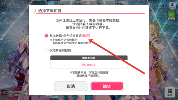 3、游戏数据下载时,选择推荐的基本数据-角色语音数据,点击确定,开始下载游戏数据。