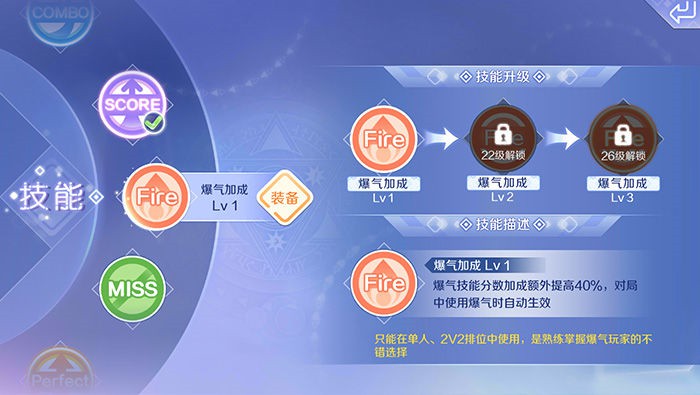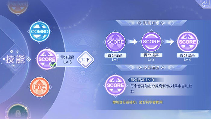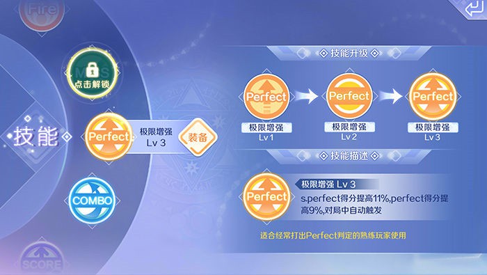 提升S.PERFECT音符节奏和PERFECT音符节奏的得分加成,比较适合节奏感好的玩家使用,尽量多的按出完美音符节奏,可以帮助我们获得更高的得分。这个技能对玩家的操作要求更高一些,对于技能流的玩家来说,这个技能更加实用。