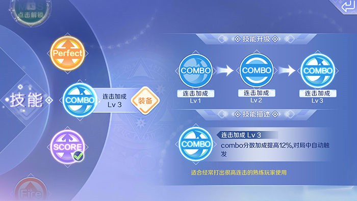 提高歌曲音符COMBO得分,比较适合可以达成歌曲ALL COMBO评价的玩家选择,这个技能最忌讳连续出现MISS,这样会损失很多的得分加成。在对当面模式比较熟悉,并且对歌曲旋律、音符熟悉的情况下,这个技能会比较实用。
