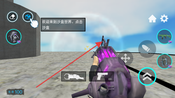 3、进入沙盒世界,按提示点击沙盒,利用界面按钮武器、建造等,在场景中建造、战斗,推进游戏进程。