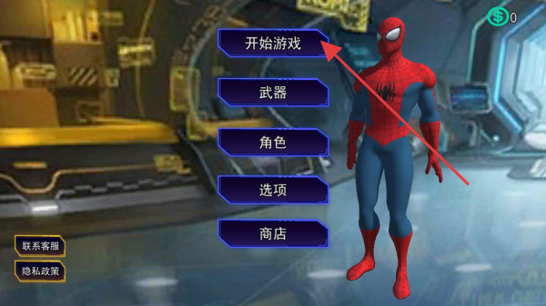 1、进入游戏主界面,点击开始游戏,操控蜘蛛侠角色,开启城市冒险,可先在武器、角色界面配置战力。