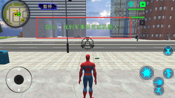 2、在城市场景,按提示找到军事坦克或机器人,利用小地图与移动摇杆,在街道、建筑间探索,寻找目标。