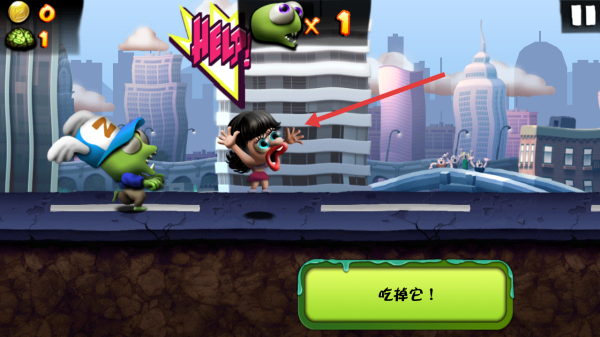 1、点击主界面开始,进入僵尸尖叫跑酷,操控戴帽子僵尸,沿城市道路前进,留意吃掉它提示,抓取人类。