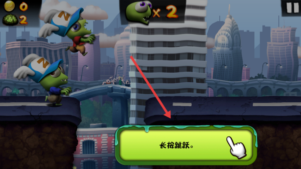 2、遇断路时,按长按跳跃按钮,蓄力跨越沟壑,保持前进节奏,收集路上金币、道具如绿色植物。