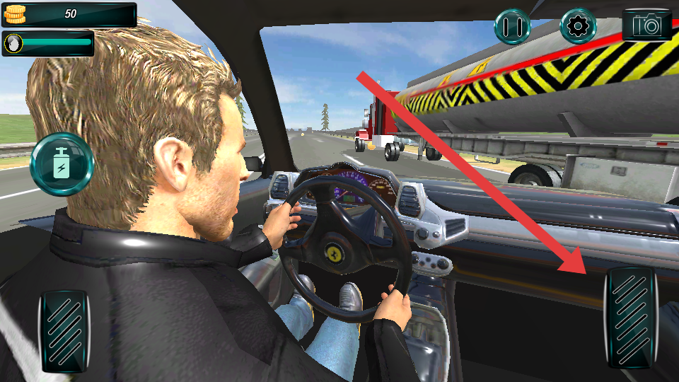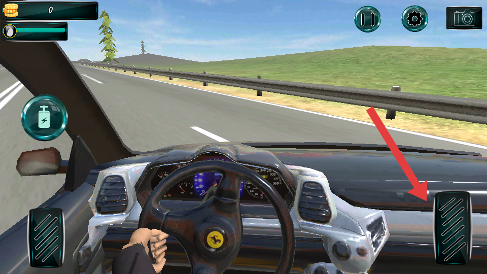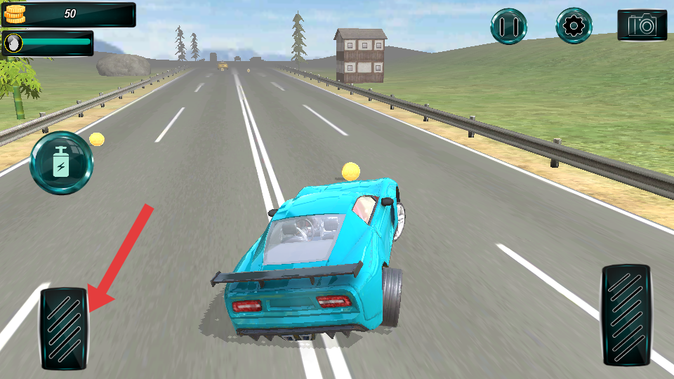 1、进入游戏,选车辆如蓝色的跑车,点击油门键的左右侧黑色按键起步,沿公路行驶,避开对向大车。