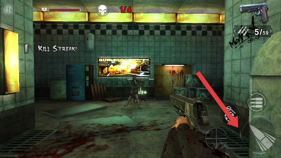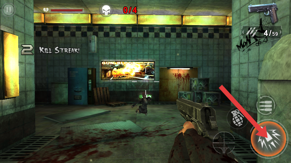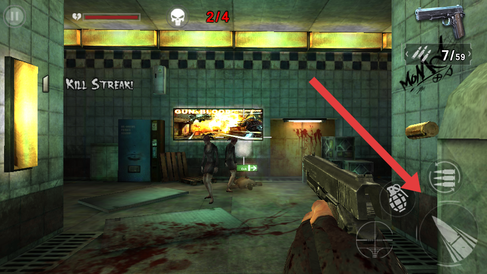 1、进入关卡,看到右侧的手雷的图标,点击可投掷手雷,清理前方聚集僵尸,注意手雷数量和冷却。