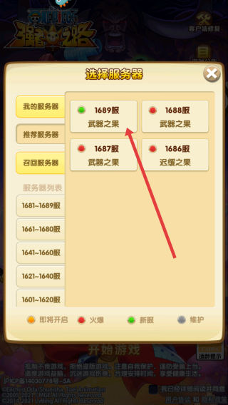 2、选择自己喜欢的服务器,例如服务器列表中的1689服武器之果,进入角色创建页面。