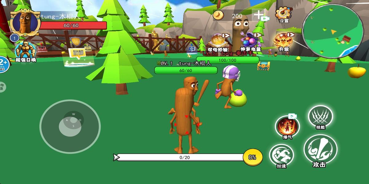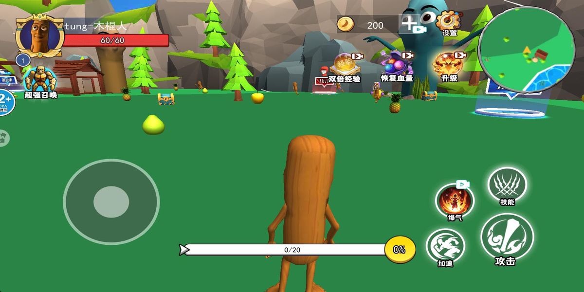 2、在场景中,左侧虚拟摇杆控制移动,右侧有攻击、爆气等技能按钮,跟随指引靠近柚子等目标,点击攻击按钮发起战斗,熟悉战斗操作。