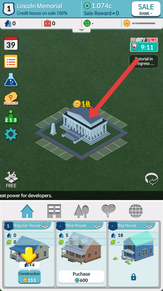 1、点OKA按键进行下一步引导,优先建Regular House花费153金币,放到林肯纪念堂旁,积攒居民数。